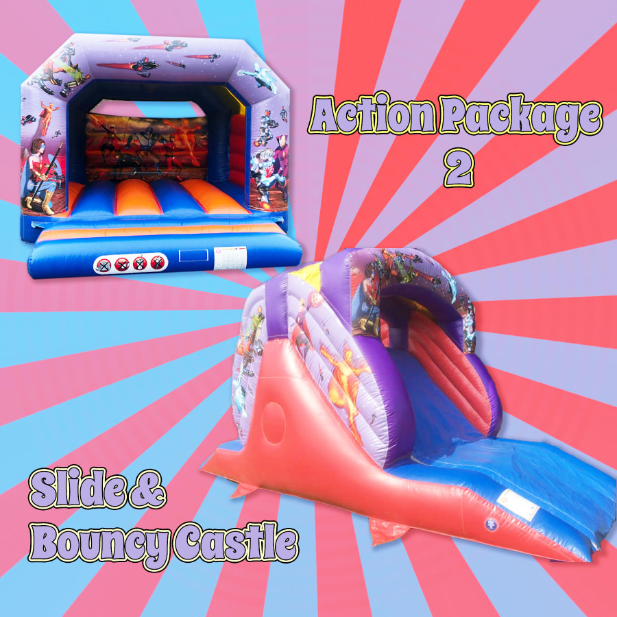Our Action Hero Package 2 features the dynamic duo of the 12ft x 12ft Action Hero Bouncy Castle 🏰 and the exhilarating Action Slide 🌟. With these two attractions combined, your guests are in for hours of action-packed fun and entertainment!