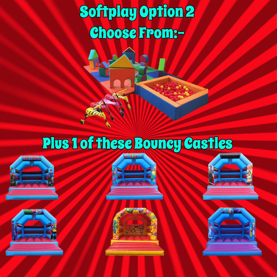 Package 2 includes our 10ft x 12ft Matted Soft Play area. You can then choose from either of our, 15ft x 12ft Super Party Bounce Bouncy Castle or 15ft x 12ft Blue and Red Bouncy Castle. We have a choice of themes you can select from.